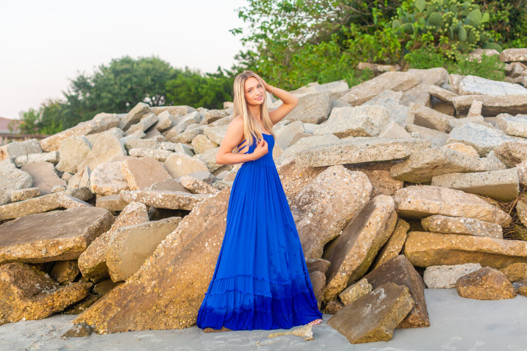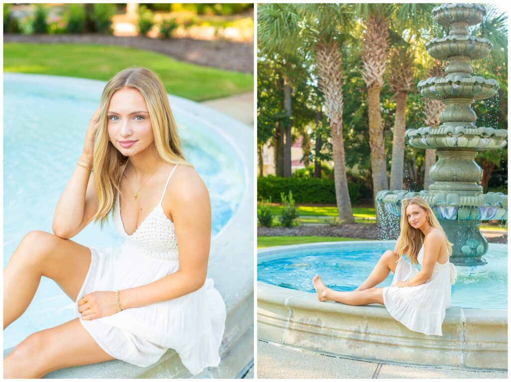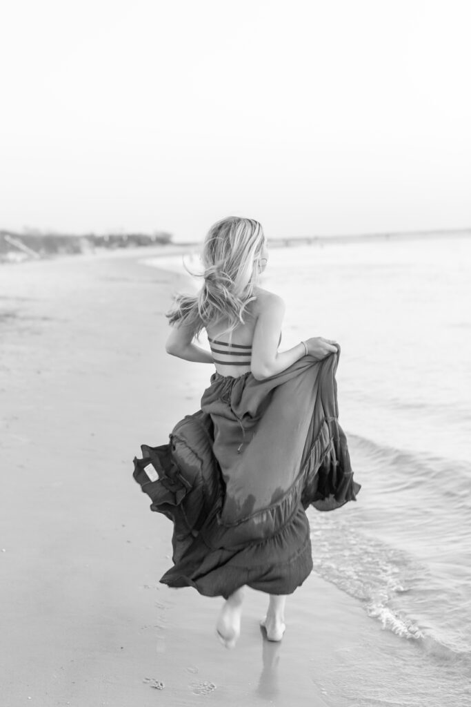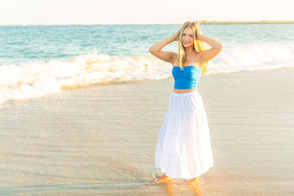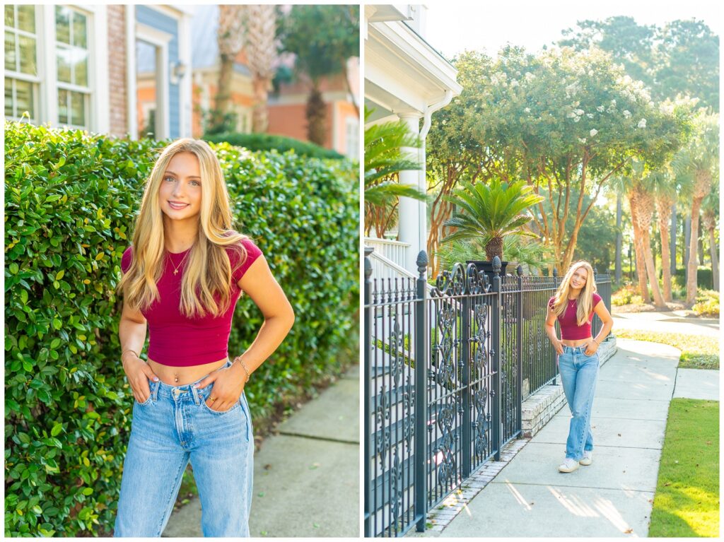 We kicked off in one of my favorite spots near Wrightsville Beach—a location that feels super coastal and has a little bit of that Charleston charm. It’s airy, colorful, and the perfect backdrop for a fresh, timeless look. Karys had two outfit changes here, which gave us a mix of both polished portraits and fun, carefree shots.